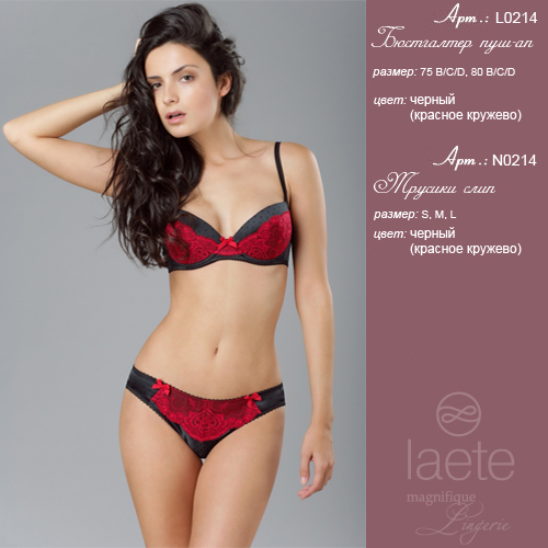 Трусики-слип из черного эластичного сатинового полотна "в горошек". Передняя часть дополнена красным эластичным кружевом и сатиновыми бантиками в горошек. Продаются только в комплекте с бюстгальтером L0214.