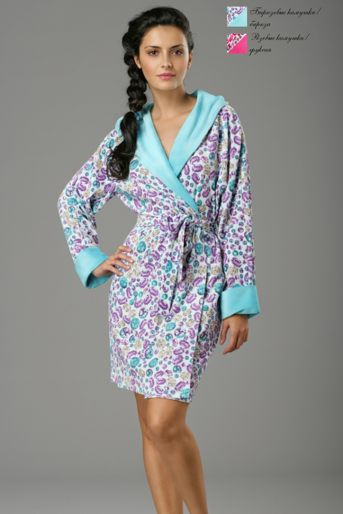 Короткий халатик из нежной велюровой ткани с ярким рисунком. Широкие отложные манжеты и внутренняя часть капюшона выполнены из однотонной ткани. Халатик с запахом,съёмным поясом и втачными карманами округлой формы.
