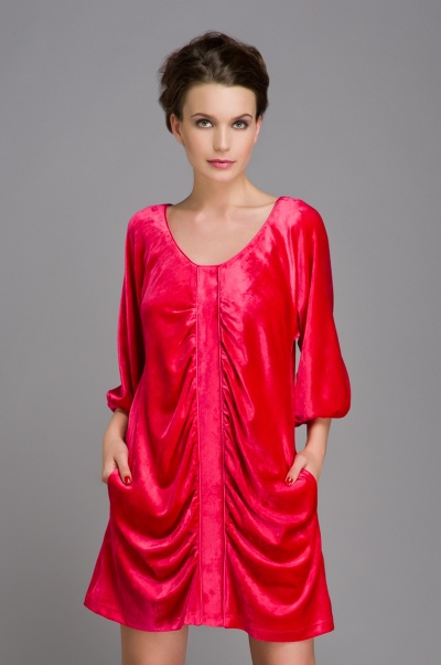 Красивая короткая туника из мягкой и лёгкой ткани с бархатистым эффектом. По центру туники располагается широкая вставка с заложенными по обеим сторонам складками. Округлый вырез горловины, рукава в 3/4 и боковые втачные карманы.