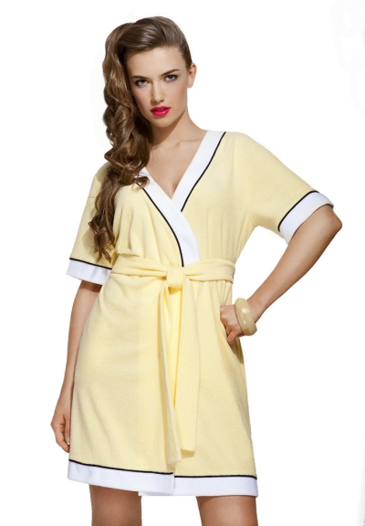 Удобный короткий халатик со съёмным поясом. Подол, края рукавов и вырез горловины декорированы контрастной однотонной вставкой.