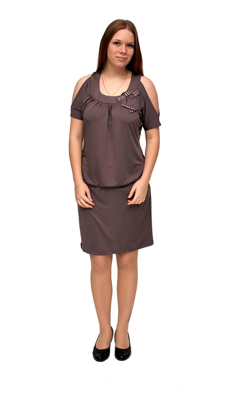 Нарядное платье. Округлая горловина. Рукав открывает плечи. Сбоку декоративный элемент. Модель с заниженный линией талии. Верхняя часть свободного силуэта, с напуском. Нижняя часть прилегающая.